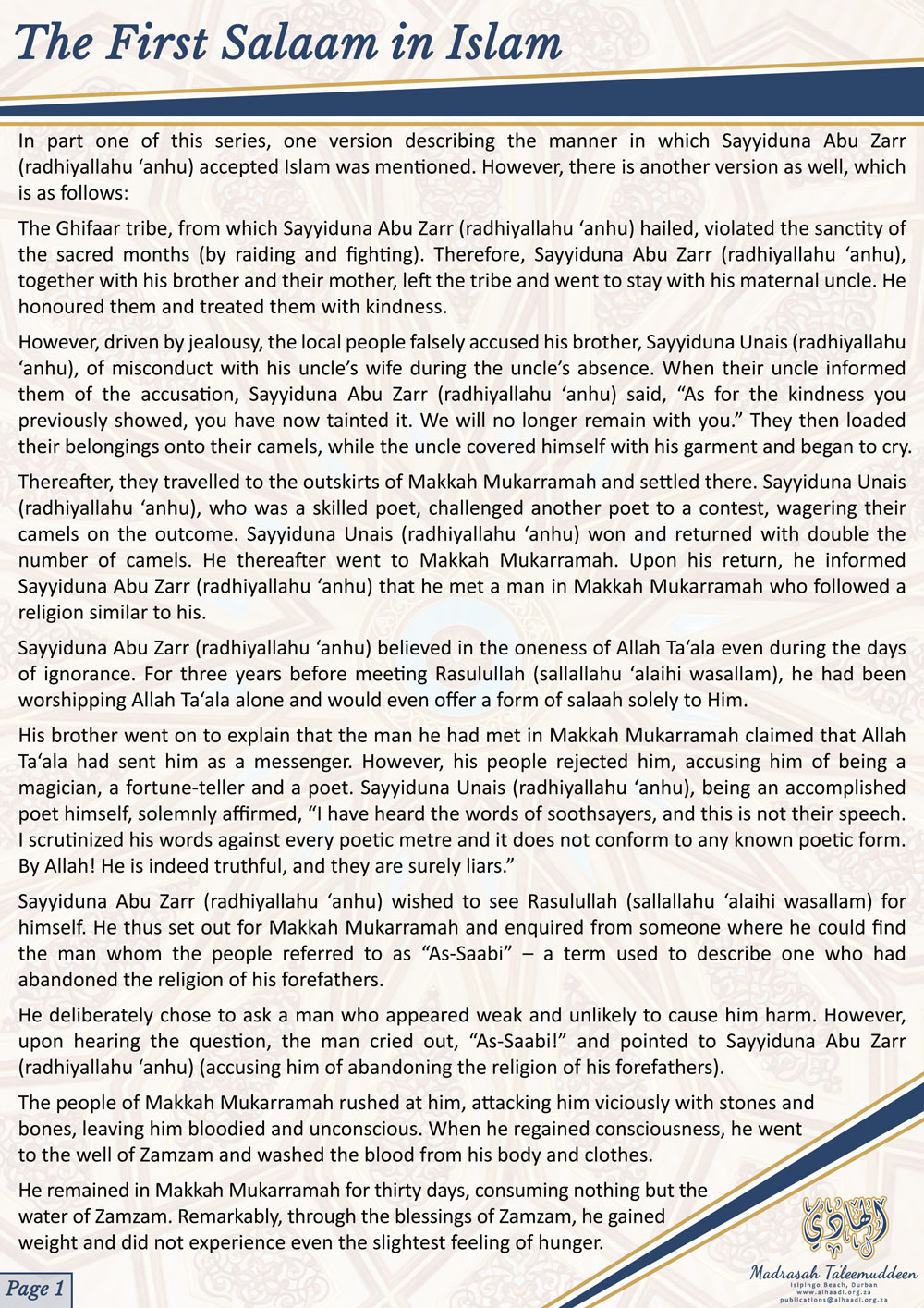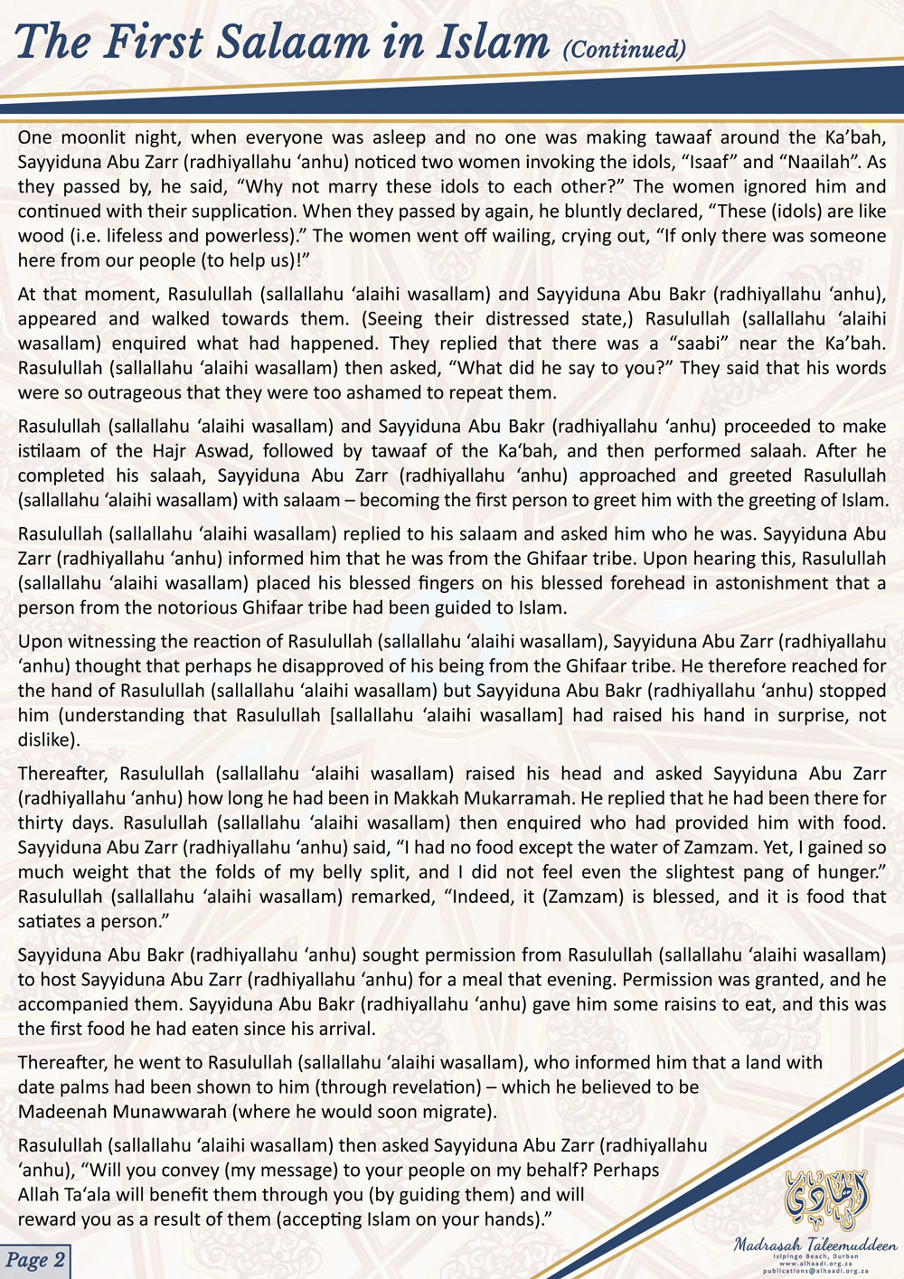 Rasulullah (sallallahu ‘alaihi wasallam) and Sayyiduna Abu Bakr (radhiyallahu ‘anhu) proceeded to make istilaam of the Hajr Aswad, followed by tawaaf of the Ka‘bah, and then performed salaah. After he completed his salaah, Sayyiduna Abu Zarr (radhiyallahu ‘anhu) approached and greeted Rasulullah (sallallahu ‘alaihi wasallam) with salaam – becoming the first person to greet him with the greeting of Islam.