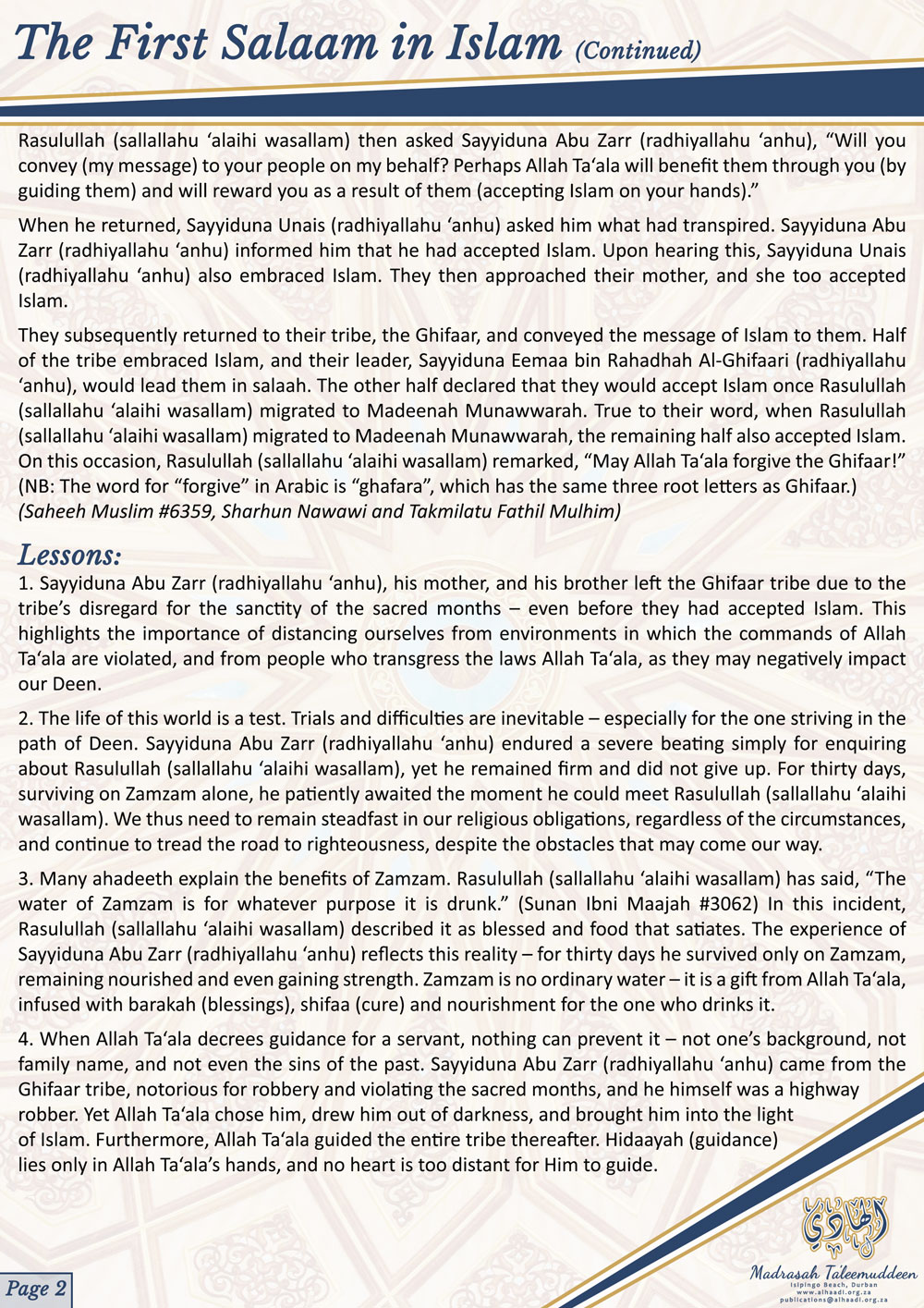 1. Sayyiduna Abu Zarr (radhiyallahu ‘anhu), his mother, and his brother left the Ghifaar tribe due to the tribe’s disregard for the sanctity of the sacred months – even before they had accepted Islam. This highlights the importance of distancing ourselves from environments in which the commands of Allah Ta‘ala are violated, and from people who transgress the laws Allah Ta‘ala, as they may negatively impact our Deen.